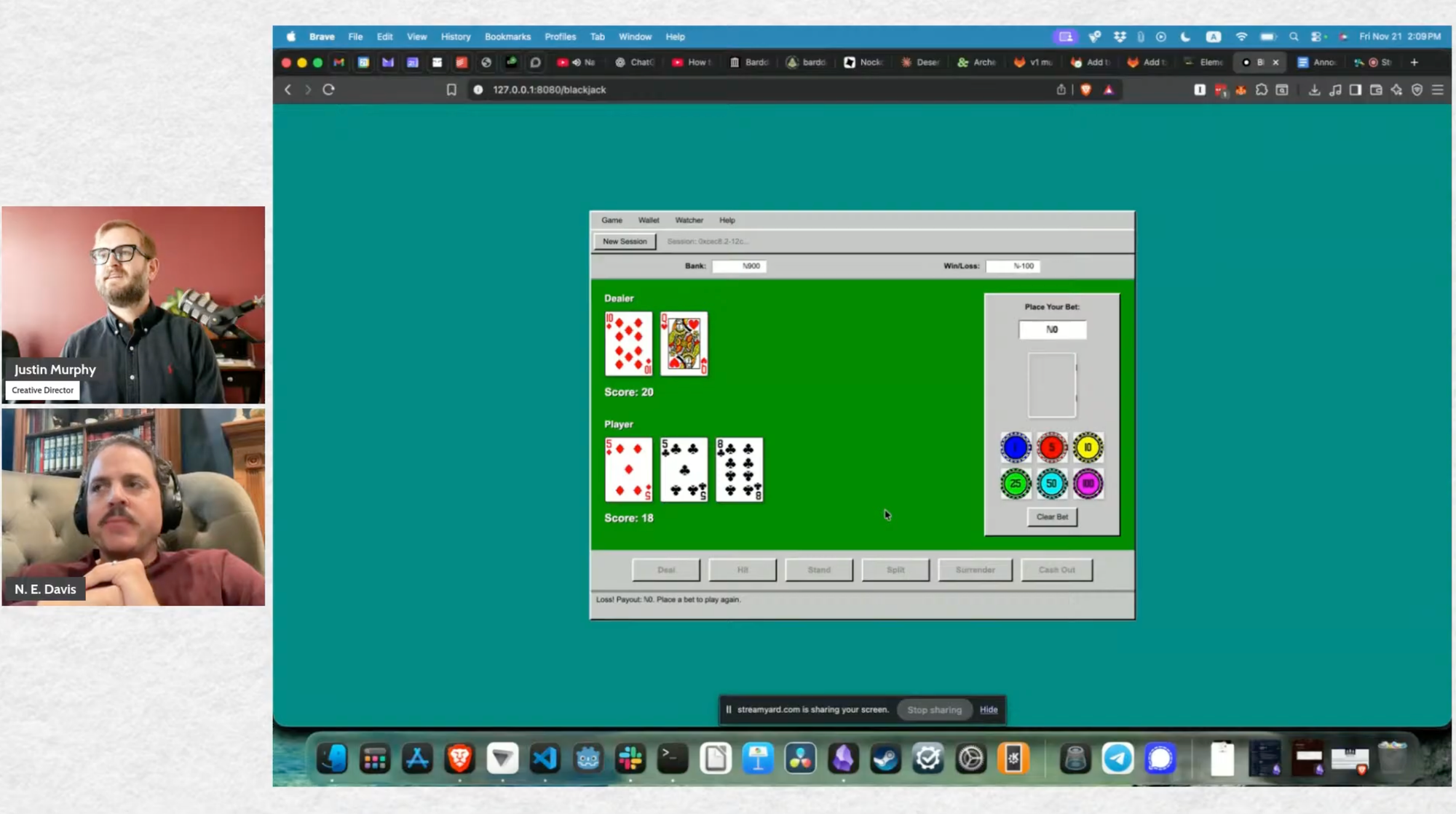 The demo app implements a complete Blackjack game (with a nostalgic Windows ‘95 aesthetic, of course). Players place bets by clicking chip icons. Deal cards, hit, stand, and watch your bankroll update in real time. Under the hood, the application uses a view/state/controller architecture: